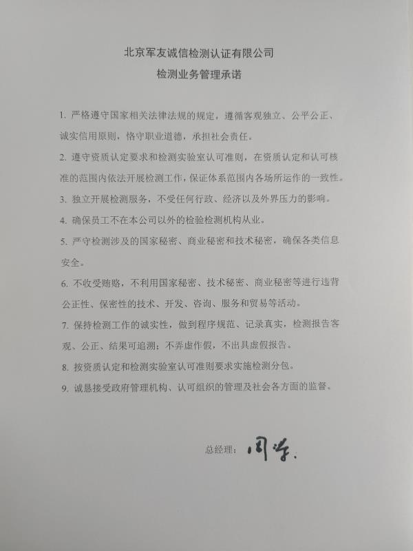 北京軍友誠(chéng)信檢測(cè)認(rèn)證有限公司檢測(cè)業(yè)務(wù)管理承諾