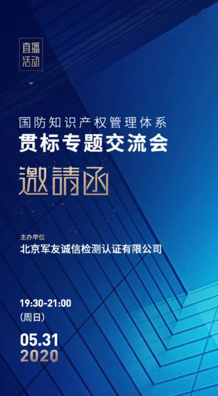 2020年5月31日19:30-21:00,北京軍友誠(chéng)信檢測(cè)認(rèn)證有限公司將舉辦第一期國(guó)防知識(shí)產(chǎn)權(quán)管理體系貫標(biāo)專題交流會(huì),誠(chéng)摯邀請(qǐng)廣大客戶朋友觀看直播。直播結(jié)束時(shí)安排抽獎(jiǎng)環(huán)節(jié),將贈(zèng)送《國(guó)防科技工業(yè)知識(shí)產(chǎn)權(quán)工作200問(wèn)》10本。