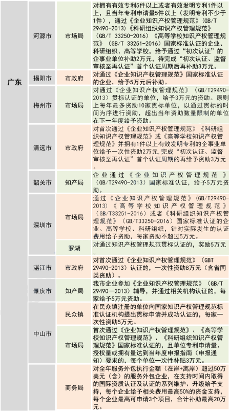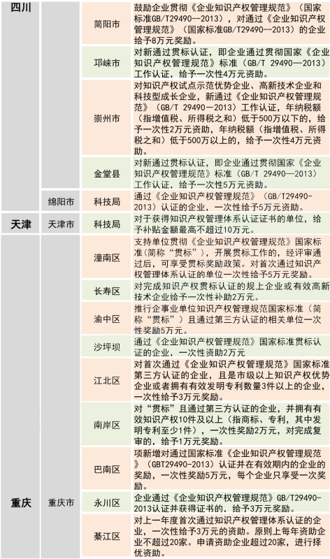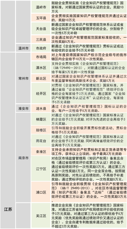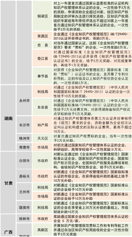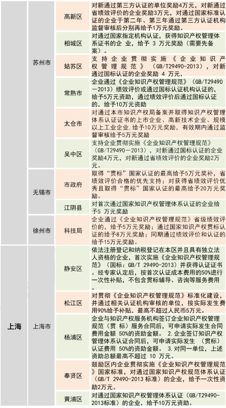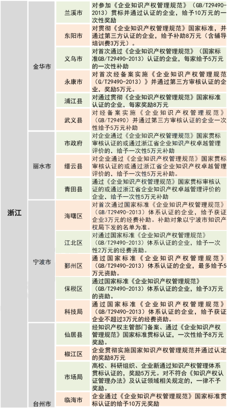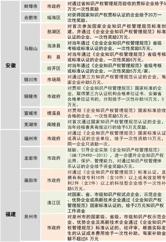 隨著市場經(jīng)濟全球化發(fā)展日益成熟,建立知識產(chǎn)權(quán)管理體系對企業(yè)作用越來越明顯?!柏灅恕睂τ谄髽I(yè)來說,就是貫徹《企業(yè)知識產(chǎn)權(quán)管理規(guī)范》國家標準。企業(yè)知識產(chǎn)權(quán)管理規(guī)范的國家標準由國家知識產(chǎn)權(quán)局制訂,經(jīng)由國家質(zhì)量監(jiān)督檢驗檢疫總局、國家標準化管理委員會批準頒布,于2013年3月1日起實施。為建立企業(yè)知識產(chǎn)權(quán)工作的規(guī)范體系,認真貫徹落實《國家知識產(chǎn)權(quán)戰(zhàn)略綱要》,加強對企業(yè)知識產(chǎn)權(quán)工作的引導(dǎo),指導(dǎo)和幫助企業(yè)進一步強化知識產(chǎn)權(quán)創(chuàng)造、運用、管理和保護,增強自主創(chuàng)新能力,實現(xiàn)對知識產(chǎn)權(quán)的科學(xué)管理和戰(zhàn)略運用,提高國際、國內(nèi)市場競爭能力,各地分別出臺了相應(yīng)的獎補措施,現(xiàn)將各地2021年現(xiàn)行的知識產(chǎn)權(quán)管理體系認證獎勵補貼政策整理給各位,供參考。