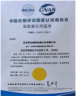 2021年9月8日,北京軍友誠信檢測認證有限公司(以下簡稱公司)正式獲得中國合格評定國家認可委員會(CNAS)授予的實驗室認可證書,同時也通過了國防實驗室(DiLAC)認可,這表明公司檢測的技術(shù)能力和管理水平均達到認可準則要求,并正式成為具備國際互認資格的檢測實驗室。