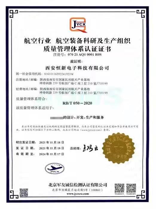 2021年11月18日,北京軍友誠(chéng)信檢測(cè)認(rèn)證有限公司(以下簡(jiǎn)稱軍友誠(chéng)信)為西安恒新電子科技有限公司頒發(fā)首張RB/T 050-2020《航空行業(yè) 航空裝備科研及生產(chǎn)組織質(zhì)量管理體系 要求》認(rèn)證證書。