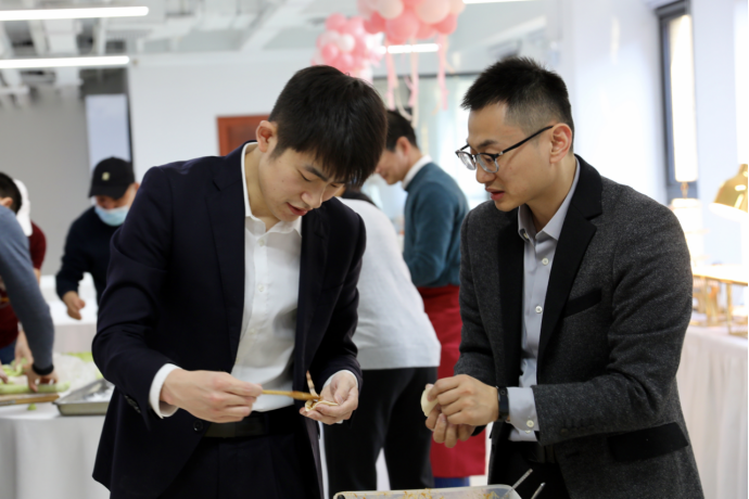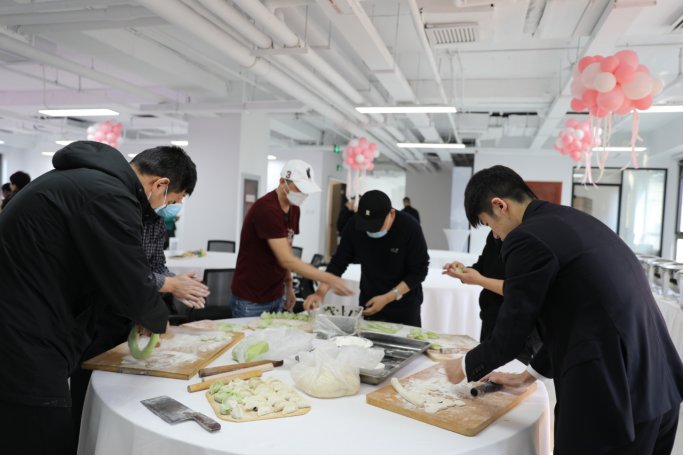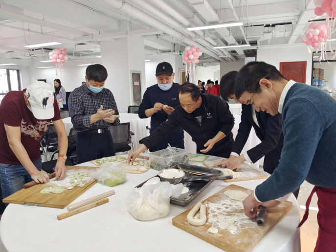 在活動(dòng)現(xiàn)場(chǎng)公司男同志們主動(dòng)走進(jìn)廚房,紛紛大顯身手,親自掌廚,展示自己的精湛廚藝,大家圍在一起有人和面、有人搟餃子皮、有人添餡捏邊,每一個(gè)步驟,每一個(gè)動(dòng)作,都透露著對(duì)女職工的祝福,歡樂的氛圍充斥著整個(gè)大廳。