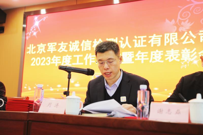 2024年1月30日,北京軍友誠信檢測認(rèn)證公司(簡稱軍友誠信)召開2023年度工作總結(jié)暨年度表彰會。公司總經(jīng)理周濤作2023年年度工作報(bào)告,總結(jié)公司2023年工作、研判內(nèi)外部形勢、部署2024年重點(diǎn)任務(wù),動員全體員工堅(jiān)定落實(shí)公司戰(zhàn)略,發(fā)揚(yáng)實(shí)干擔(dān)當(dāng)精神,努力將公司建設(shè)成為新型武器裝備質(zhì)量權(quán)威機(jī)構(gòu)。公司副總經(jīng)理謝志磊和副總經(jīng)理張恩澤分別宣讀《關(guān)于公司2023年度考核評優(yōu)結(jié)果的通報(bào)》和《關(guān)于公司2023年度保密先進(jìn)集體和保密先進(jìn)個(gè)人評優(yōu)結(jié)果的通報(bào)》。公司書記趙顯立主持會議,軍友誠信全體員工參加。