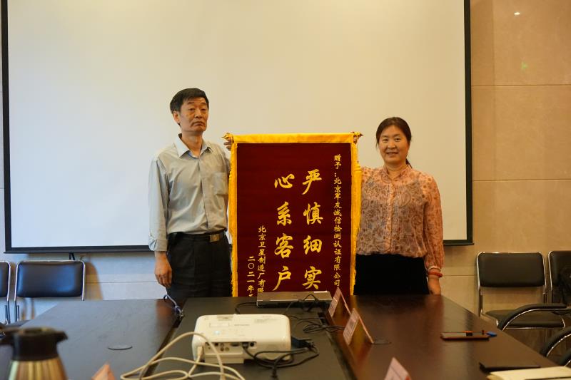 5月28日,北京衛(wèi)星制造廠有限公司(簡稱衛(wèi)星制造廠)總質量師陸永平一行3人,將一面寫有“嚴慎細實 心系客戶”的錦旗送到了北京軍友誠信檢測認證有限公司(簡稱軍友誠信),對軍友誠信真誠幫助企業(yè)解決實際問題以及高效優(yōu)質的服務表示感謝,并與軍友誠信總經理王巧云、技委會主任石二奎、總經理助理張皛等相關工作人員進行了座談。
