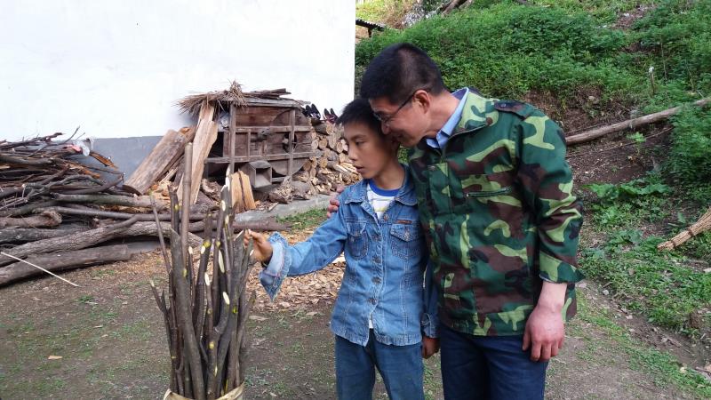 回村委會的路上,我們迎面遇到了一個剛從山上砍柴回來的小男孩,約摸十幾斤重的柴把他壓得一肩高一肩低。王淘快步迎上去,把他的柴捆卸下放到地上,摸著男孩兒的肩膀低聲跟他說“德坤,歇會兒”,溫和地詢問“早上吃飯沒有,最近課程多不多,生活費夠不夠用......”當王淘重新把柴捆放到男孩肩上,扶正,目送他離開時,王淘的背影輕輕發(fā)抖。